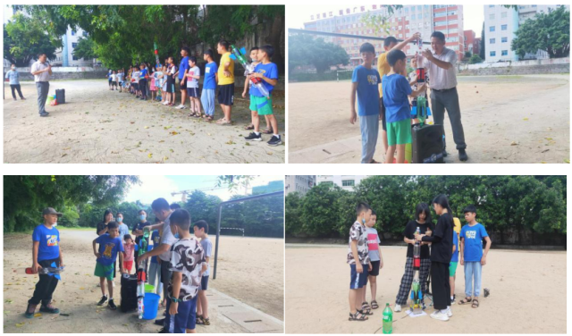 在完成水火箭制作后,学生们跟随老师来到操场。经过老师的指导,学生们顺利完成多级水火箭测试。伴随着“轰”的一声,一枚枚火箭顺利升空,现场爆发出一阵阵激动的欢呼声。