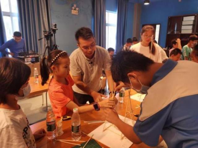 抛石机制作课程中,学生们认真观摩模型,并积极向老师请教,团队协作共同制作,发射成功后学生们欢呼雀跃,即使失败了也不气馁,小组认真讨论后再调整制作。