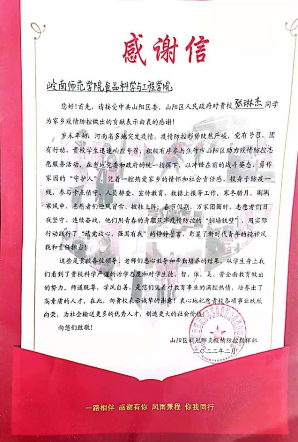 近日,岭南师范学院收到一封来自河南省焦作市山阳区新冠肺炎疫情防控指挥部给该校食品科学与工程学院2021级食品科学与工程专业张琳杰同学的感谢信。信中,中共山阳区委、山阳区人民政府对张琳杰2022年寒假期间为家乡疫情防控作出的贡献表示由衷感谢,并对岭南师范学院思政教育和素质教育作出了高度评价。