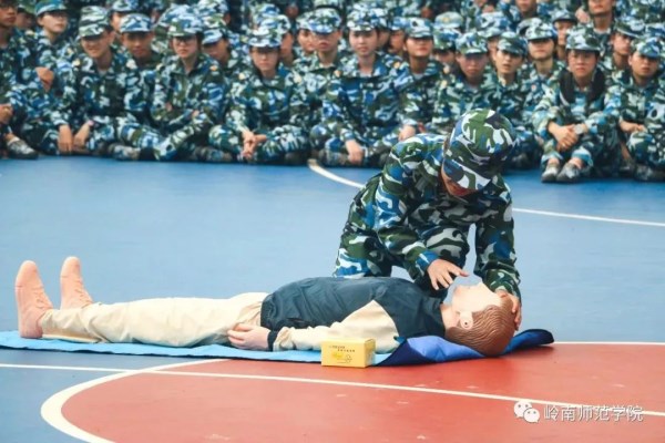 军训中,岭南师范学院举行了急救知识培训和消防演练,学生们认真聆听教官讲解,用心牢记要领。
