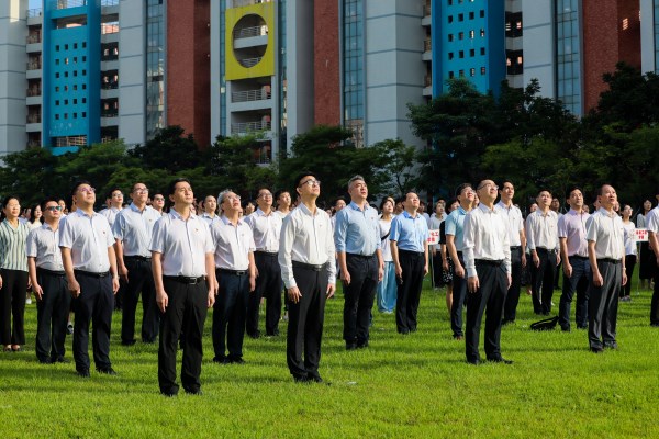 上午8点,国旗手昂首阔步,踏着整齐响亮的步伐,护送国旗来到升旗台。在雄壮的国歌声中,五星红旗迎着太阳在微风中冉冉升起。学校党委副书记黄达海、副校长金义富、王胜等在校校领导与师生代表齐聚国旗台前,向国旗注目敬礼,表达对伟大祖国的无限热爱和崇高敬意!