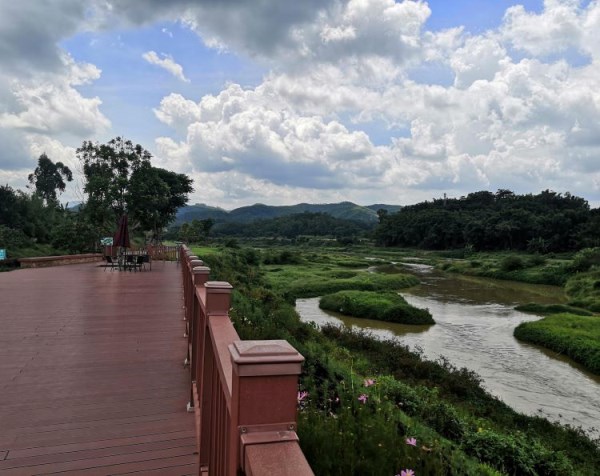 信宜市镇隆镇八坊村休息休闲区-休息于河畔边上,观赏着江景风光,沉醉于蓝天与白云