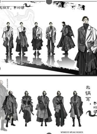 他的设计融合了岭南建筑锅耳山墙的设计特色。男装系列突出青砖墙外搭配着“瓦当”图案,以建筑外形作为轮廓结构,细节上以锅耳的形状曲线和形状分割进行展现;女装系列以西装为基本款,加以锅耳建筑结构、拼接、重组等方式进行廓形延展,颜色上用黑白灰还原建筑群最本质的色彩层次。