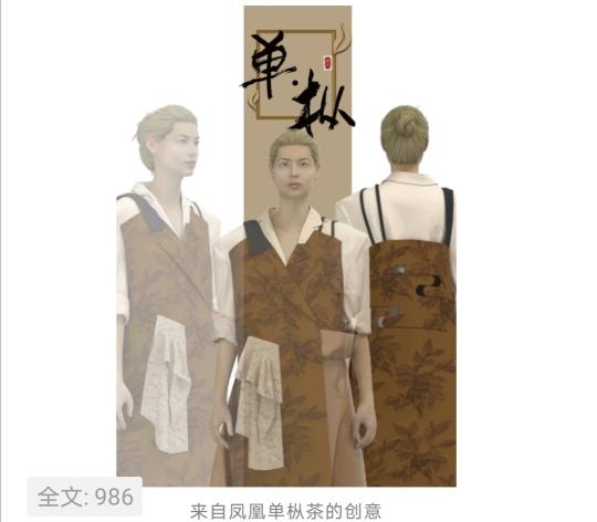 田晋玮同学为了探寻“凤凰单枞茶”的设计内涵,无数次在冲泡品味观察的过程中获得了创作灵感。他的创作以茶色为主色调,通过对茶叶的形态以及茶在冲泡过程中色彩、气味等进行分析与服装结合碰撞,展现了单枞茶的特点和文化内涵。高级成衣3D建模运用刺绣、镂空、比例等表现手法,增添了设计的魅力。