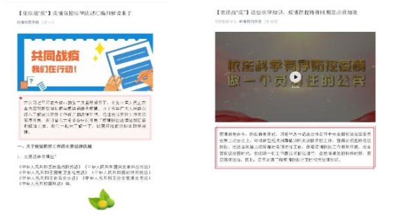 中山大学新华学院迅速、精准、扎实开展疫情防控法治宣传工作。学校官网、官微发布疫情防控法律知识科普和新闻动态信息300余篇,教育引导师生依法依规科学理性做好居家防控;开设战“疫”必懂、辟谣、警示、科普专栏,精准选编社会、高校的违法违规案例进行法治解读,把防疫法规知识讲准讲活、弄懂学实;线上线下宣传相结合,投入电子屏6块、横幅10条、海报21张、宣传册5000份,营造浓郁的防疫法治宣传氛围。
