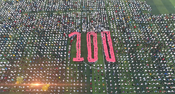 在校园的拍摄现场,激昂的歌声不断吸引着同学们的加入,连在拍摄毕业照的毕业生也主动将自己的毕业纪念融入到快闪当中。在田径运动场,上万名参与升旗的师生高喊“祖国,我爱你”的口号,在列队中拼出“70”和“100”的图案为祖国祝福向“五四”献礼;在学校东大门,同学们举起“扣好人生的第一颗扣子”的牌子一起深情歌唱;在古榕广场,大家不约而同走在一起,举起手中五星红旗,围成了一片红色的“中国心”。