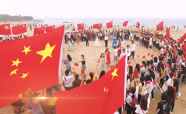 在湛江金沙湾广场,嘹亮歌声响彻了整个海湾,师生舞动的五星红旗,变成了一道红色的风景线,吸引、打动了广大的湛江市民,他们自觉地汇聚在拍摄现场,跟着岭师学子一起手拉着手,脸上洋溢着笑容,共同讴歌伟大祖国,不少人被歌声所感染,留下了激动的泪水。