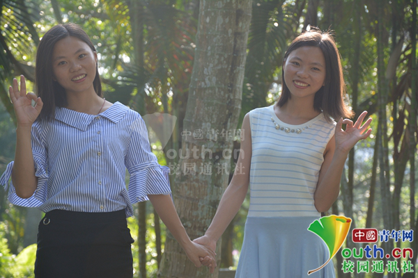 陈娇文是两人从专科到本科的室友,“一直以来都分不清出谁是姐姐,谁是妹妹。两个人几乎一模一样,平时在宿舍,不看脸只听声音,也是没办法分辨的。现在要毕业了,终于掌握了方法,那就是看她们平时穿的衣服。”陈娇文说,两个姐妹平时比较开朗乐观的,然后学习的时候就会变得非常安静、勤奋。