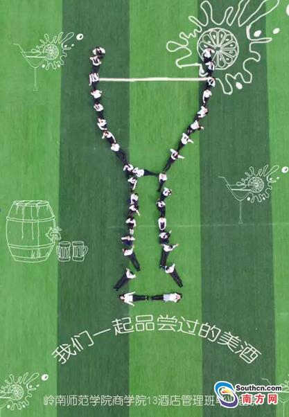 岭南师范学院地处湛江,12月份的粤西依然树木葱绿,气温在20度左右,气候宜人,紫荆花繁盛,阳光充裕,非常适合户外活动。岭师13级商学院酒店管理毕业班的学生们就全部躺在草地上,结合校园特色和专业设置,用“酒杯”的造型来呈现“我们有酒,我们有故事”的主题,成为一道亮丽的风景。13酒店管理专业的麦敏玲说:“以酒杯的造型,很符合我们酒店管理专业特色,航拍毕业照给我们大学四年留下特别的回忆,原来毕业照也可以这么拍。”