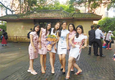 昨日上午,岭南师范学院即将毕业的女学生穿着旗袍拍毕业照,十分抢眼。网友供图