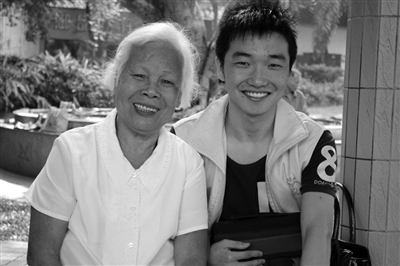社工助理、岭南师范学院大三学生朱宏鹏与帮扶老对象冯阿姨合影