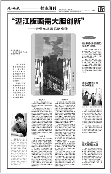 日前,记者走进岭南师范学院,对青年版画家、美术学院教师陈志强进行采访,去聆听他心中的版画情结。