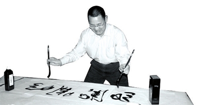 2007年湛师“教工才艺大展”,三耳兄面对八尺宣纸,背对数千师生,双手搦管,挥洒“风流千古”正反字,每个字脸盆大小,引发阵阵尖叫。