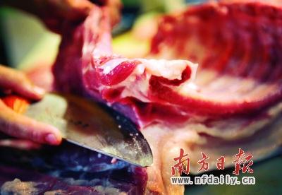 当几十斤的边猪被扛上案板,屠刀已在鲜嫩的肉上横飞直闯,依附在瘦肉上的碎油被迅速切掉,然后挥霍着大刀把边猪砍成两半,再顺着排骨将肉与其分离,短短几分钟就将边肉按不同部位分解成肉头、猪手脚、排骨、瘦肉、花肉等,同时嘴里还不停地叫喊着“大公司、大品牌,上过中央电视台”等口号吸引顾客。