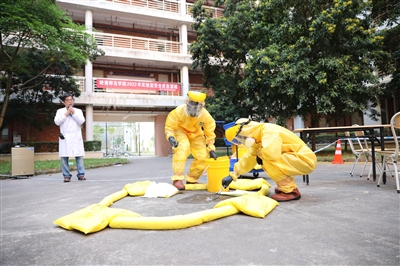 本报讯 报道:每年的11月是全国消防宣传月,近日,岭南师范学院在第四教学楼A、B栋之间的空地上举行实验室化学品意外泄露安全处置演练活动。
