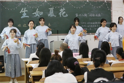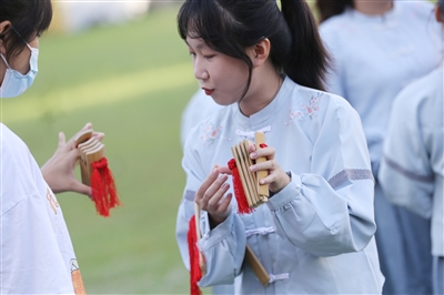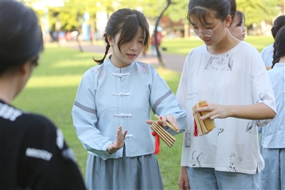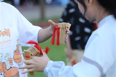 随着深入学习,兴趣就越发浓厚。队长陈楚儿说:“快板队每周训练两次,师兄、师姐手把手教学,帮助新队员掌握快板技巧,有些队员利用课余时间到田径场加紧练习,争取早日熟练。”