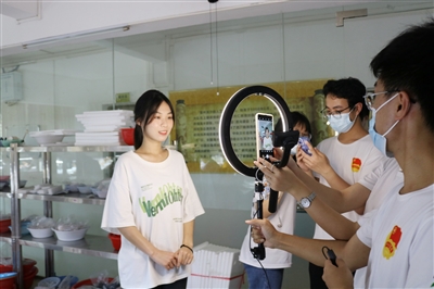 岭师大学生实践队员走进南珠工艺间直播,带网友们了解南珠文化。