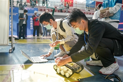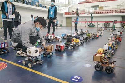 据悉,该赛事将机械、电子、计算机技术、信息技术等多种学科知识交叉并进行融合创新,往届竞赛中,一批批优秀的高技能人才从中脱颖而出,成为炙手可热的应用型和技能型人才。本次比赛在延续传统的基础上进行升级,通过智能终端配送机器人、3D设计与制作、全地形越障排爆小车等形式呈现比赛项目。现场,随处可见精密的终端配送机器人和全地形排爆小车,选手们紧张忙碌地调试设备。在大学生创新创业园,3D打印设计与制作竞赛同样气氛热烈,选手在工位上按要求进行零件的设计及3D打印,现场颇为壮观。