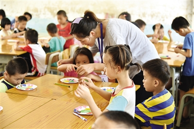 “盐庭村是岭南师范学院大学生社会实践基地,我们在1周前还举行了揭牌仪式。”岭南师范学院晨曦服务队队长郭艳说,他们来此开展“三下乡”活动实践,为了锻炼孩子们的动手能力,以及培养专注和创造能力,共开设了少儿国画、手工课(如图,通讯员 吴智雅 摄)、创意美术、体育课、舞蹈课、音乐课、师生交流、兴趣班等课程。