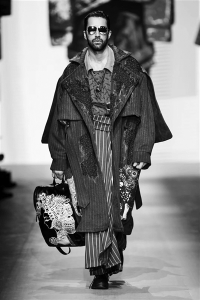 该系列服装选用黑色和灰色作为主色调,取自皮影在幕布下的投影,黑色运用在男装上也显得更加沉稳。在中国传统文化中,红色代表吉利、乐观,皮影人物中对红色的运用也很多,所以用红色做一个跳跃的搭配色,使不同明度的灰色与色彩之间更加的融合;面料再造突显抽象、条纹形态的视觉效果,由于粗细线条渗化程度的不同和均匀等关系的影响,多了几分“拙”的效果,更好地体现出商务男装所带的时尚感和高级感。配饰方面则增添了毛领,包和墨镜,让系列服装变得更加具有整体感。最终,《戏如人生之剪影》脱颖而出,勇夺时装类金奖!