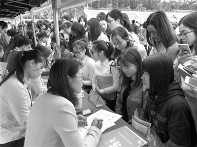 当天一大早,前来求职的毕业生便有序地排起了长队,等待进场。除了岭南师范学院本校的毕业生,还有不少从珠三角甚至外省等地专程赶来应聘的毕业生。在肇庆学院就读的大四毕业生小梁,昨日特意从肇庆赶回湛江,希望在家乡找到一份满意的工作。她一连向湛江本地的中小学校投出了多份简历,“我是湛江人,虽然知道在珠三角当老师工资比较高,但还是希望能够回到家乡工作,离家人更近,能为家乡的教育尽自己的一份力量,这也是我当初选择师范类专业的原因。”