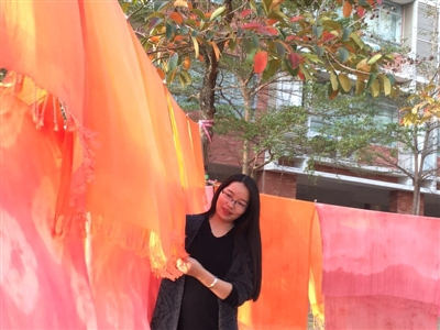 初冬的太阳落得早,五点多就斜阳西照,明晃晃的光映照着岭南师范学院教学楼前的一片小树林,树与树之间挂着晾绳,新染的草木染围巾在风中轻轻地招展,橙红、桔红、粉红……如同满天彩霞,绚丽多姿。