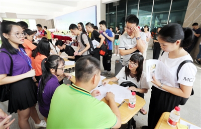 在绿色通道的登记点,众多的学生前来咨询与填写资料。