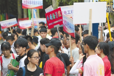 9月8日,岭南师范学院高年级学生手持各式指引牌欢迎新生。 记者 林石湛 摄