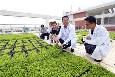 刘金祥教授蹲在草坪边,微笑地说:“这片屋顶绿草已经生长五六年了,即便冬天枯黄,可到了春天又会自然生长。年年如此,生命力顽强,并不需要花人力物力来管理。下雨时,这片绿草能自动吸水储水;高温时,降温效果非常棒。”