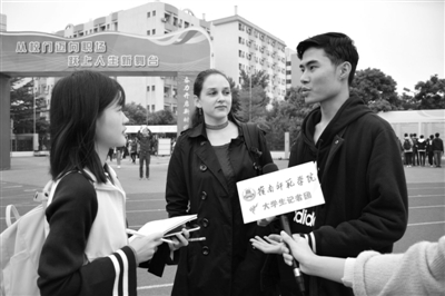 在岭师读大二的英国留学生维也纳(中)和越南留学生阮德旺(右一)也来提前体验应聘。通讯员 庄禹毅 摄