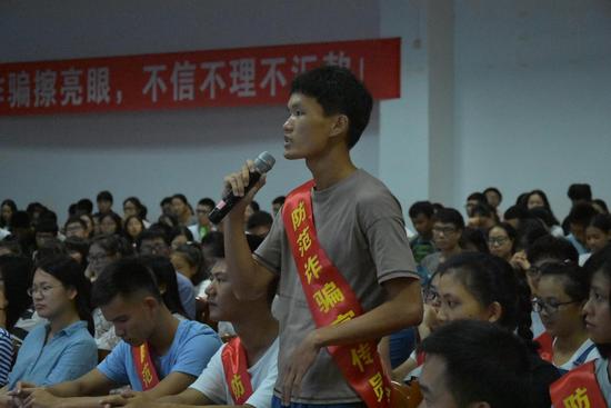 警察蜀黍表演的一段又一段与骗子的“机智对话“,让学生们哈哈大笑。蜀黍的小品给学生们展示了冒充银行、校园贷、奖学金诈骗、冒充公检法等诈骗手法,给新生们上好了别开生面的防范诈骗 “第一堂课”。 面对蜀黍“你们知道这些对话代表了哪些诈骗”的提问,他们纷纷举起手来。
