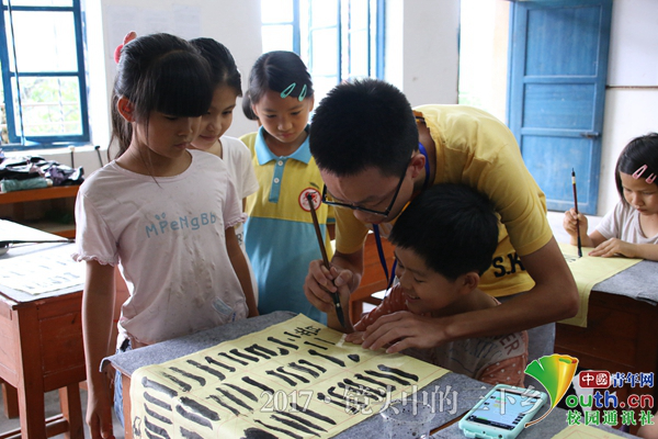 支教老师辅导学生练习书法。 中国青年网通讯员 黄碧珊 摄