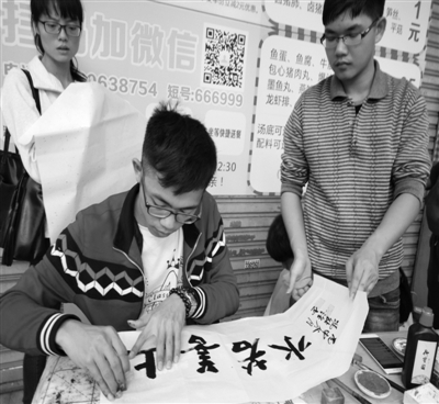 湛江晚报12月21日讯:“两张写字桌,一张置着笔墨纸砚、印章,一张用于写书法;一群大学生志愿者站成一排,有的双手拉着写有‘上善若水’的宣纸、有的跟前立着一块整齐写有求助者详细信息的KT板、有的双手捧着红色募捐箱、有的手持‘爱心留言’板……”这一幕场景发生在日前岭南师范学院内,吸引了不少路过的在校生驻足观看。此次活动的发起人是该校一位数计院数学与应用数学专业的大四生,他的名字叫冯能强。