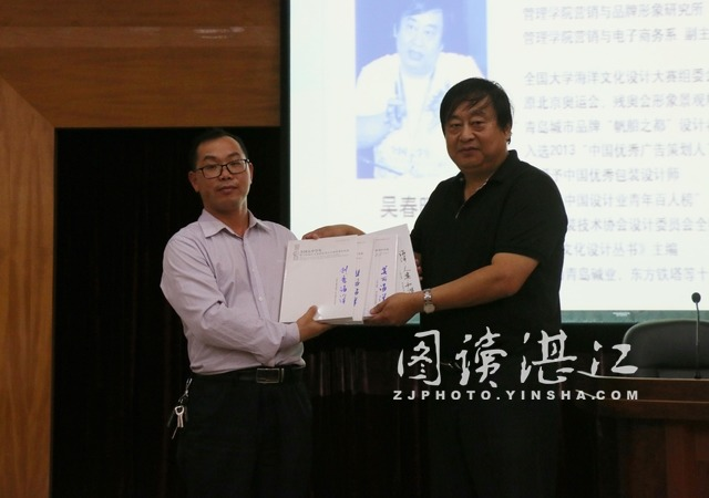 在讲座过程中,吴春晖还着重介绍了由中国海洋大学主办的全国大中学生海洋文化创意大赛的相关情况,大赛自举办五届以来,社会影响愈来愈大,受到各界广泛关注,相关作品参加过“台湾巡回展览”、“美国华盛顿世界海洋大会展览”等国际相关交流活动。吴春晖指出,大赛的举办不但使参赛者受益,对于促进两岸以及各地区的交流是非常有意义的。他还向大家展示了近年来大赛优秀作品,并向该院赠书一套。