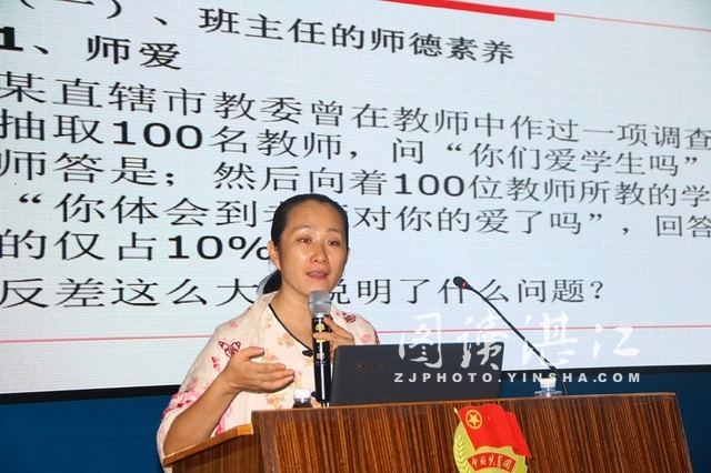 张妙龄就“智慧性班主任三大能力”和“主题班会的设计”进行了简要的概述。同时,她结合自己的工作经验,深入浅出地讲述了“班主任专业化发展”:一、做好班主任自我定位。在面对班主任工作时,应从小事做起,避免眼高手低,要抵制浮躁,尽力超越自己;二、更新班主任教育理念。班主任要树立平等的学生观、以生为本与为学生服务的教育观、发展性的多元评价观,关注学生个体差异,挖掘学生的发展潜能,多角度综合评价学生的个人成长;三、提高班主任的师德素养和知识素养。她认为,只有具备“师德、知识、能力、心理”四个层面的素养,才能更好地胜任班主任工作;四、找准班主任专业化发展的原动力和途径。张老师提出年轻班主任成长的十字决:读书、写作、反思、研究与交流,并勉励在座师范生要从当下做起。另外,张妙龄还向同学们分享了班主任专业化“未雨绸缪、防微杜渐、亡羊补牢”的三种境界。