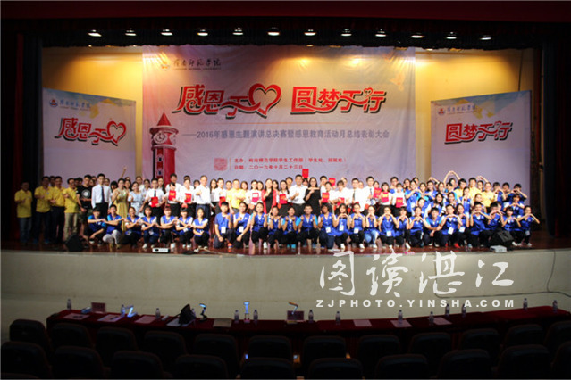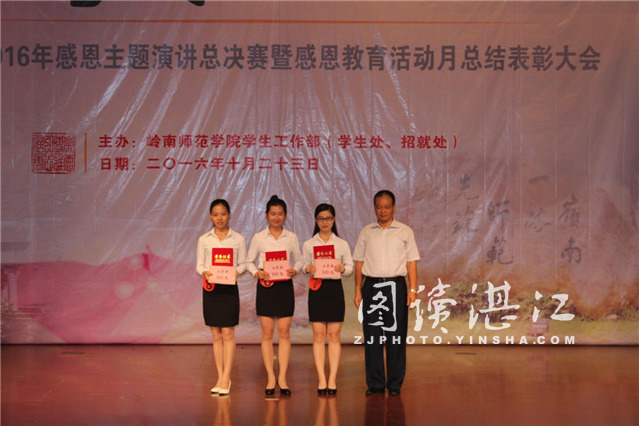 碧海银沙网10月27日讯:为大力推行感恩教育,展示岭师学子风采,营造校园的感恩教育氛围,2016年10月23日晚,岭南师范学院学生工作部在音乐厅隆重举办了2016年“感恩于心•圆梦于行”主题演讲总决赛暨感恩教育活动月总结表彰大会。党委宣传部谢应明部长、学生工作部李粤部长和陈永国副部长、文学与传媒学院赵敏副教授、共青团湛江市委学校部少工委专干黄恋婷校友、学生处各科室负责人、各二级学院负责助学工作的辅导员、“感恩•圆梦”义工服务队学生干部、进入决赛的10名演讲选手以及来自各学院的16级新生代表参加了大会。