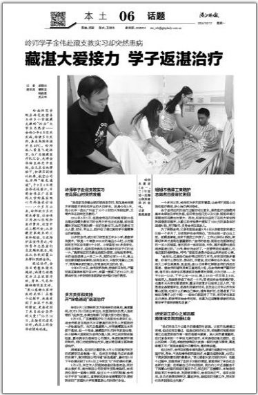 湛江晚报10月17日讯:岭南师范学院在林芝波密县玉许乡小学援藏支教的“90后”大学生志愿者——金伟今年8月突然发病,持续多日发热,甚至高烧体温升至40℃。岭师派人紧急飞赴林芝,与广东援藏医疗队汇合,先将金伟转至林芝市医院,后又在当地帮助下,协调买到候补机票,航空公司也开辟“绿色通道”,于9月6日将金伟送返湛江,目前金伟在广东医科大学附属医院心内科接受诊治……一个多月以来,岭师校方多次前来看望,让金伟不用担心住院和医疗费用,还雪中送上慰问金;从安徽老家赶来的父亲和姐姐,日夜陪护在金伟身边;岭师青年志愿者们自发踊跃报名,轮流从赤坎到霞山来帮忙照顾金伟。