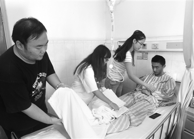为了照顾金伟,父亲和姐姐金晶9月6日从安徽老家来湛江已经一个多月了,日夜陪护在金伟身边,“我在合肥一家企业上班。前期是请假,后来干脆把工作辞了。工作以后可以再找,照顾好弟弟才是现在最重要的!”金伟的爸爸、姐姐住在医院附近的一间小旅馆里,每天两点一线来回走,中秋、国庆假期也是在病房里度过的,“小伟,等你完全好了,一定要带我玩遍湛江,吃遍这里的海鲜美食,呵呵!”姐姐总是想方设法让弟弟放松心情。