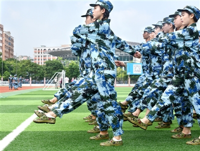 湛江晚报10月11日讯:9月份的尾声,湛江各个高校的田径场内响起了分列式进行曲,新生汇成一片蓝的绿的海洋,各个学院组成一个个方阵,“首长好”、“为人民服务”……随着每个方阵新生们铿锵有力的呐喊口号,军训阅兵仪式上,大学新生以最昂扬的姿态、最饱满的精神展示了过去十几天的训练成果,他们的每个动作都充满了朝气和自信。