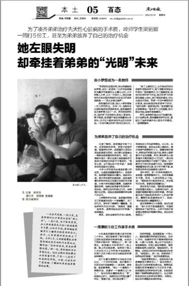 湛江晚报10月14日讯:一台老式电视、一张沙发,是梁丽媚记忆中家里仅有的“两大件”。一直以来,由于家庭贫困,加上弟弟患有先天性心脏病需要手术费,从初中开始,梁丽媚就有辍学打工赚钱补贴家用的念头。然而,父亲梁建洪坚决阻止了她。去年9月,父亲骑着摩托车将梁丽媚送到当地的汽车客运站,嘱咐她:“你好好读书,家里的事情别管。”那一刻,梁丽媚的泪水夺眶而出。这位左眼失明的肇庆女孩背着行李,只身一人来到了岭南师范学院。日前,记者采访了梁丽媚,了解她和弟弟姐弟情深的故事。