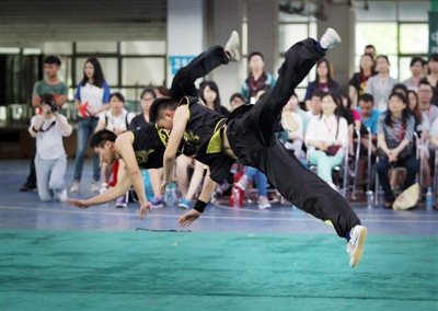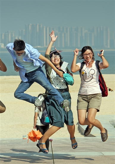奥体中心外的沙滩上,台湾大学生兴奋地高高跃起。