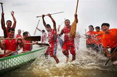 一般人到海边是戏水,然而我们的摄影记者在龙舟赛现场却常被水“戏”。他们为了能拍到更近、更有动感的照片,掀起裤腿,迎着涨潮的海水走出去,立于水中拍摄。拍得兴起时忘记了还在不断上升的海水,上岸才发觉已经“湿身”到大腿根了。所以,采访龙舟赛的记者,绝对不会西装革履,我们往往是“入乡随俗”,一身短衣短裤、穿着拖鞋、头顶草帽、眼戴墨镜,活脱脱的“新闻民工”打扮。