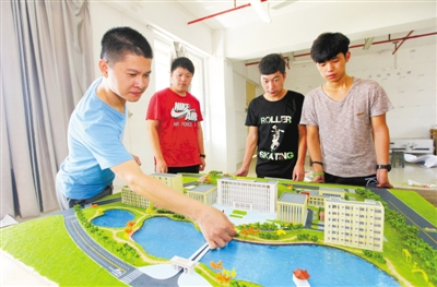 岭南师范学院环境设计专业讲师谢东(左一)指导学生制作建筑模型沙盘。 记者 吴智恒 摄