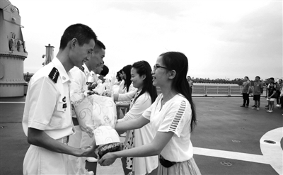 当天是海军节,一大早,南海舰队新型船坞登陆舰“井冈山舰”迎来了一批共度海军节的特殊客人。 当天上午,来自广东海洋大学等高校的大学生代表,向井冈山舰10位“最美水兵”献上鲜花并与他们深入交流、畅谈感受。在军旗下,许多女大学生争着与海军首批上舰女水兵、全国第十七届共青团代表吴桐合影,来自广东海洋大学的林敏难掩激动之情:“过去我梦想当海军,可总担心女生会不适应。看到吴桐姐这么英姿飒爽,我决定了,回去就报名!”