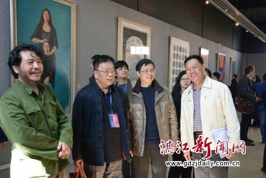 广东省美术和设计教育专业委员会会长、广州美术学院院长黎明(左)等与会代表在岭南师范学院美术学院院长巨云(右)陪同下参观美术学院师生教学成果展和教学设施环境。 李书然 摄
