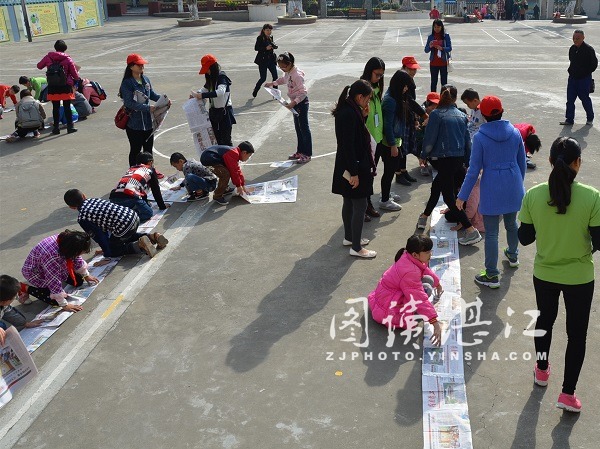 继而,14数本4班志愿者还给留守儿童共同带来了别出心裁的游戏环节:激情节拍、无敌风火轮。其中,在进行无敌风火轮游戏时,志愿者与留守儿童齐心协力用报纸和透明胶接成一个大圆圈。接着,他们排好队站在圆圈内,数着节拍,齐齐走到终点。由于这两个游戏都是志愿者与留守儿童一起进行的,所以游戏现场不仅井然有序,而且充斥着孩子们的天真笑声。