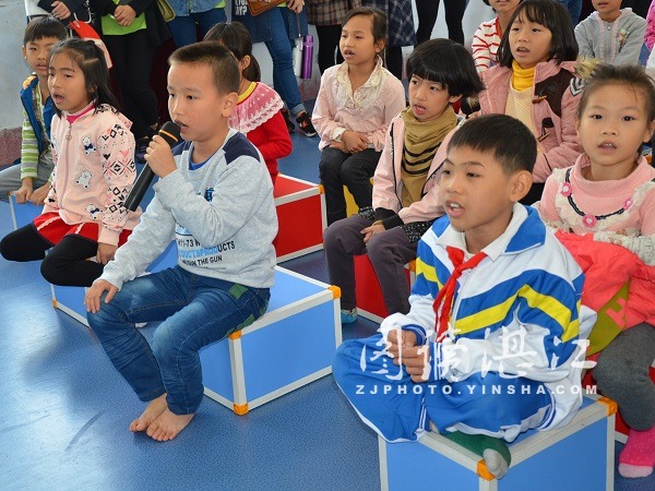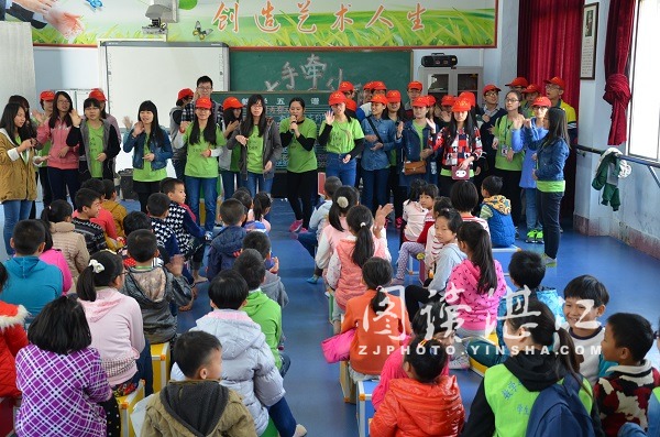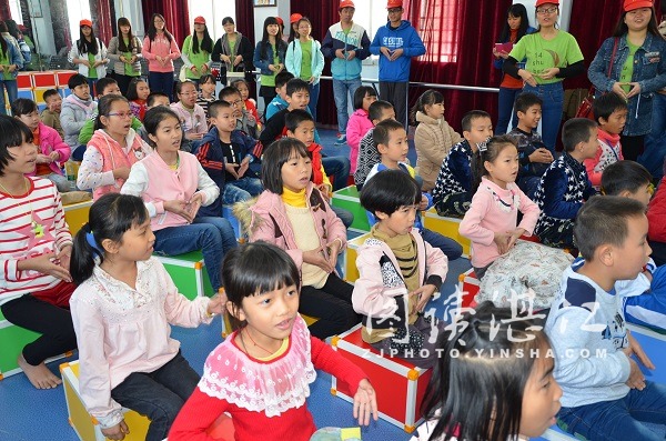 首先是与留守儿童共同学习手语《爱 因为在心中》。在14数本4班的志愿者的指导下,一群活泼可爱的孩子一边地跟着志愿者一句一句地歌唱着,一边跟着志愿者的大手,挥动着自己的小手,一个词一个词地学做手语,一边学着体会流淌在彼此心中的爱。听闻志愿者说,唱得最好、手语学得最好的有奖品,孩子们就更用心地学了,纷纷“脱下”初见面的羞涩外套,跃跃欲试,仿佛担心轮不到自己表演一样。后来,孩子们索性就向哥哥姐姐们挑战,于是一场精彩的手语PK便上演了。最后,格外认真学习的孩子们毫无悬念地胜出了。