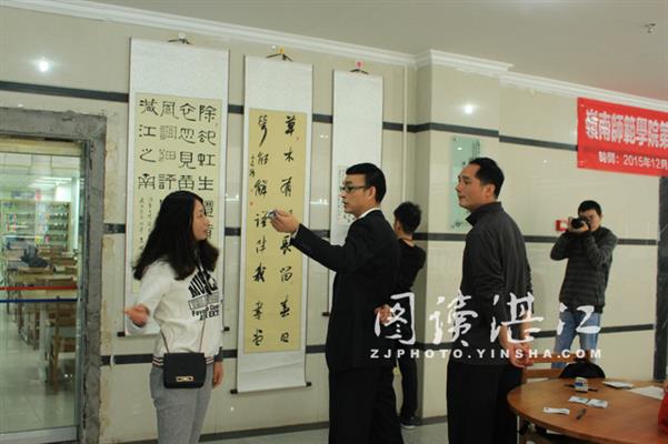 碧海银沙网12月18日讯:12月中旬,岭南师范学院书法协会在图书馆 五楼举行了第九届“燕岭杯”大学生书画大赛开幕式,学校党委宣传部关天冲副部长,中国书法家协会会员、赤坎区书法家协会主席、岭南师范学院书协99级校友 黄建文先生,校团委李仁煜老师,美术学院书法系主任李吾铭老师以及兄弟院校的书法社团的代表来宾也来到了现场。在活动中学校党委黄达海副书记也前来观展。