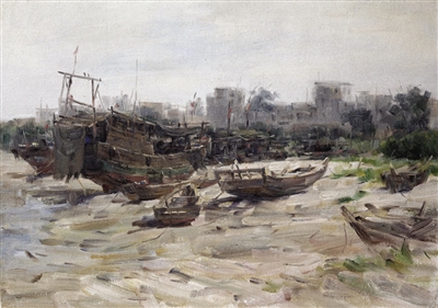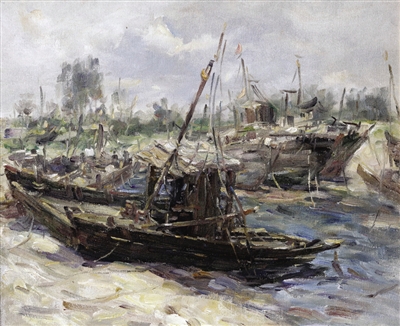 这种安静的深沉的诗意成为巨云和作品的格调,不事张扬,却寓意丰富,经久耐品。他的用笔如泥水匠的瓦刀,痛快淋漓地抒发着对雷州半岛深厚的情感,在他的渔港系列中,各种姿态的船与大海、天空、海岸融为一体,各种灰调像跳跃的音符,演奏出一曲华丽的乐章。