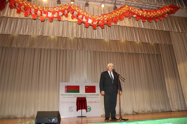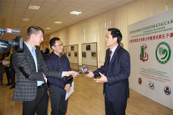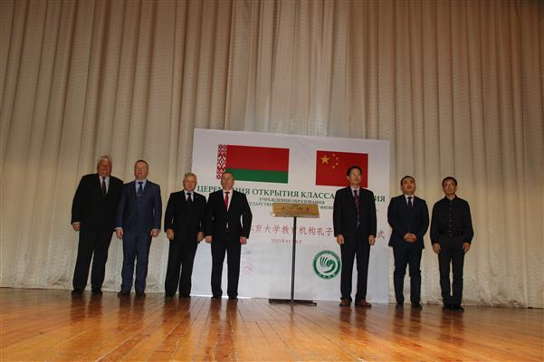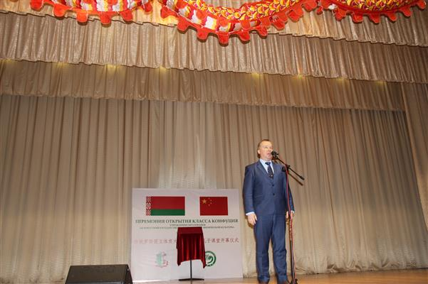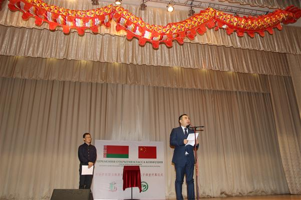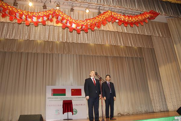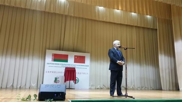 在仪式上,托吉克热烈祝贺孔子课堂的成立,特别强调孔子课堂是中白教育文化联系的桥梁纽带,希望双方以此为机遇,更好发展中白在体育文化方面的合作;沙莫克即希望合作双方借此平台,更好地发展体育项目和技术合作,推进双方体育人才培养;拉科夫在讲话中称不少白俄罗斯青少年都是通过孔子课堂(学院)的学习进而了解中国文化,这对发展两国友好关系意义重大;王大军代表我国驻白俄大使馆祝贺孔子课堂揭牌运行,这是在继吉林大学、大连理工大学、东南大学分别与白俄工业技术大学、白俄国立大学、明斯克国立语言大学共同开设孔子学院后在白俄第一所独立的孔子课堂。王大军说孔子学院(课堂)是连接世界人民文明的纽带,是传播中华文化和心灵沟通的桥梁。武术是中国文化的瑰宝,包含着中国体育博大精深的精神,白俄国立体育大学的孔子课堂以武术和中华养生及中文人才的培养为特色,将赋予孔子课堂新的内容和吸引力,孔子属于中国,也属于世界;孔子课堂中方负责人岭南师范学院的宋鹏博士宣读了中国孔子学院(国家汉办)总干事许琳女士发来的贺信。